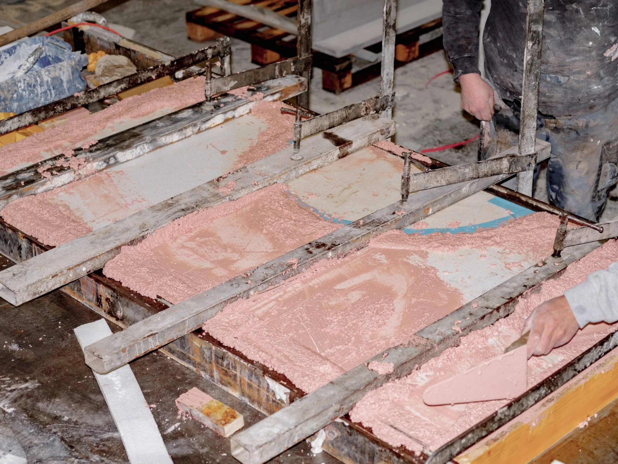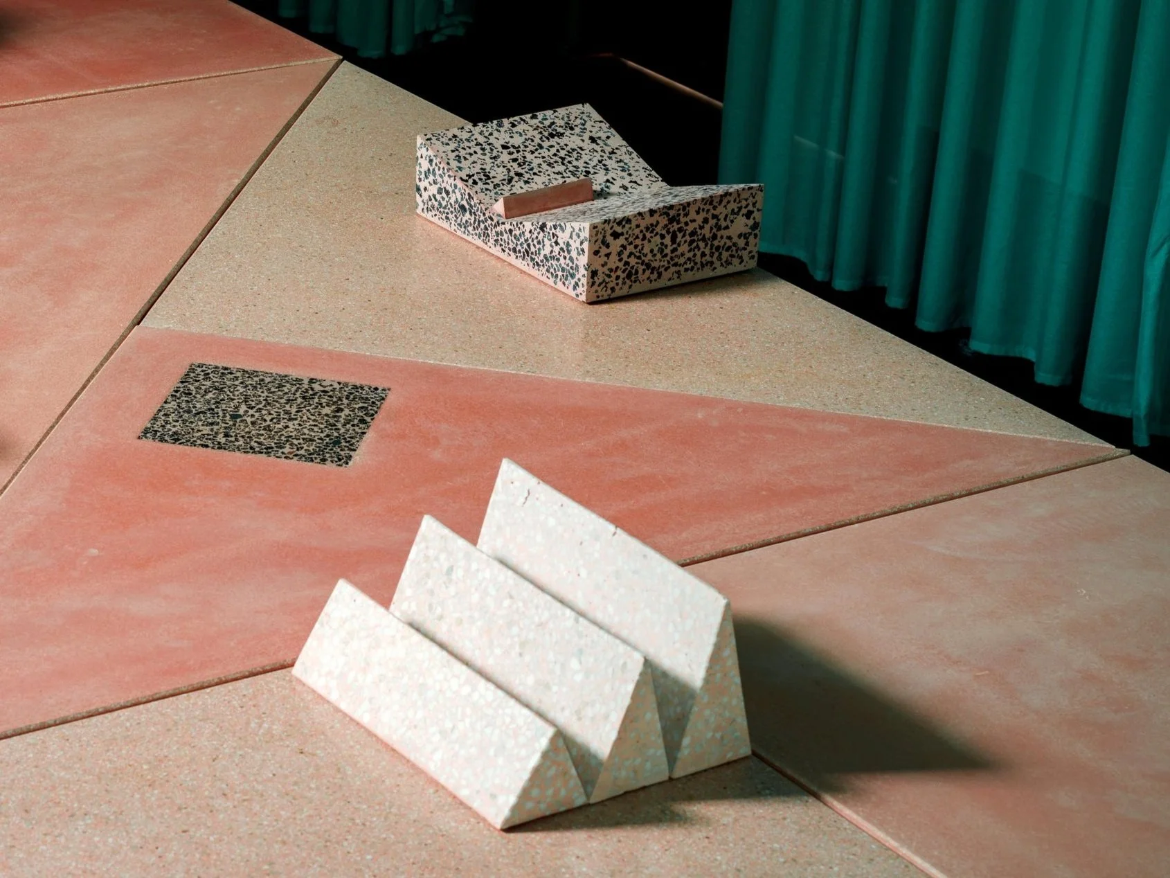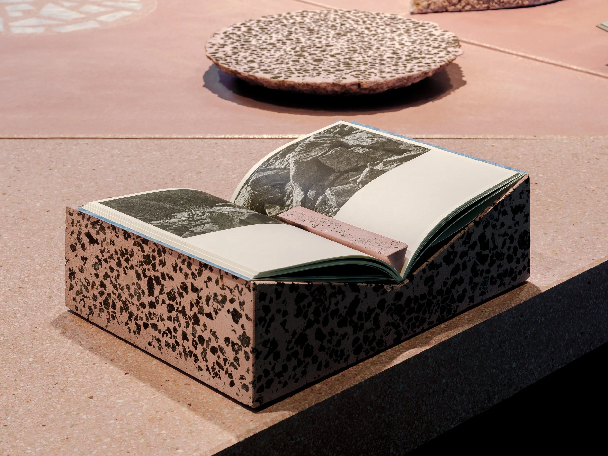 Massi Erratici takes inspiration both from the tradition of stone and terrazzo working in the Bergamo area, and from the agricultural Roman centuriation of its territory, a subdivision that is still visible, transformed by use over the centuries, often still legible as a principle of organization of landscapes and infrastructures. We imagined these artificial stones - composed of circular concrete and aggregates obtained from the crushing of waste materials - as erratic boulders, which could bring the museum’s public closer to those who work there and to the works on display. The same surfaces on which one works one day, or sits for a few minutes, can be used to display works of art, framing people and objects, plants or books, in the same picture and with the same attention.
