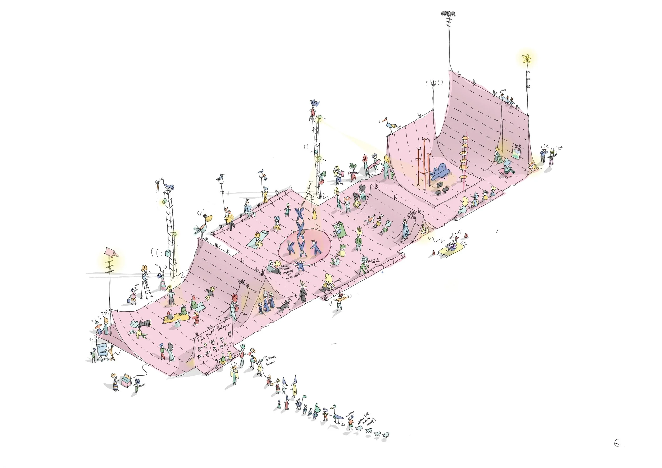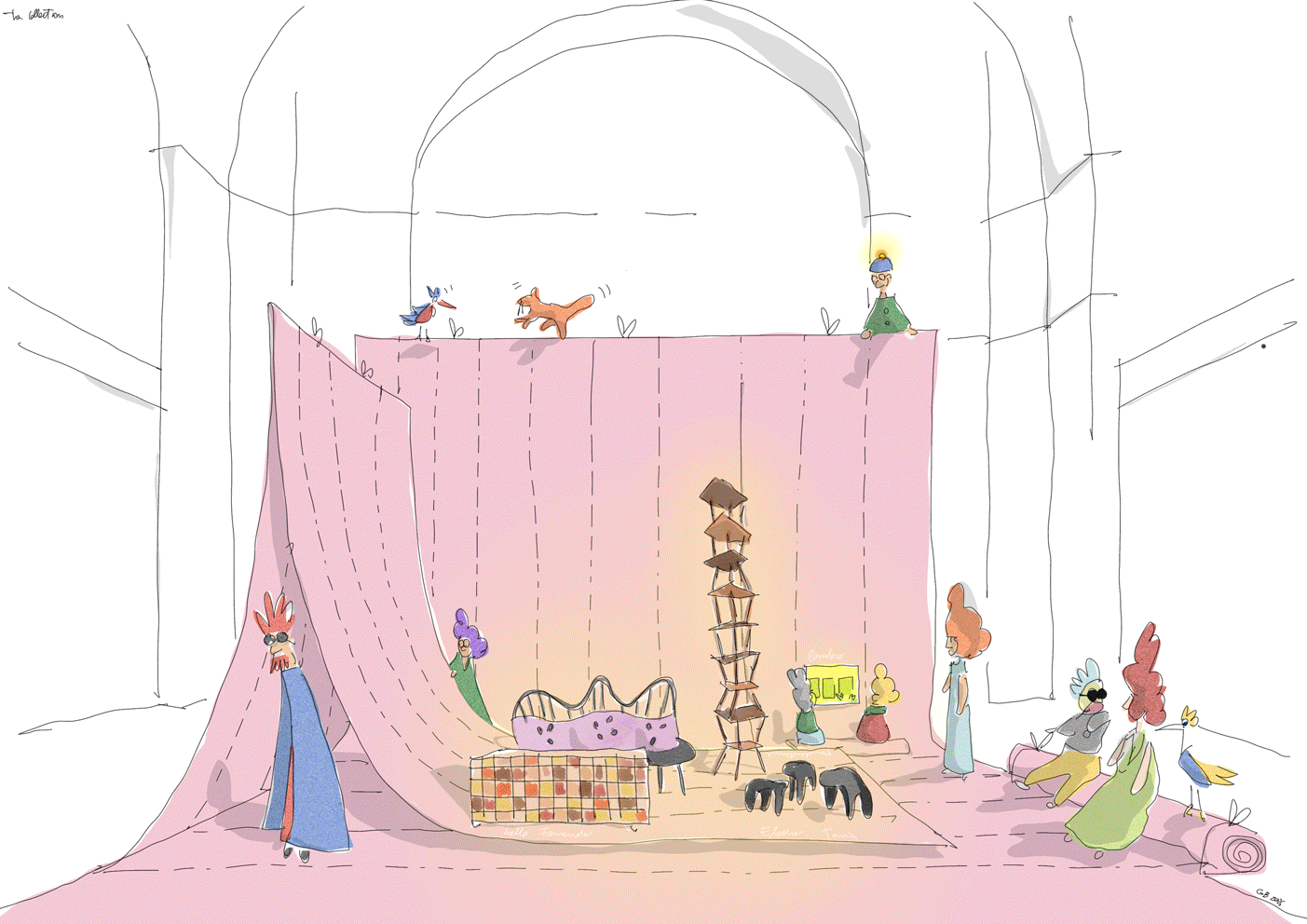 We thought of this place as a soft palace, an address for big and small assemblies, events, exhibitions, where to be together, play, discuss, listen, but also where one could hide, have a nap, choose to be alone, and find the intimacy of a shelter a few steps away from a public assembly or a performance.